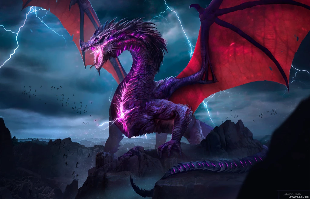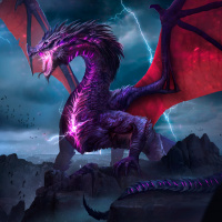 a dramatic sky with lightning strikes and dark clouds, suggesting either a storm or some sort of battle or event involving the dragon. The color palette is predominantly dark, emphasizing the power and intensity of the scene. The creature itself has