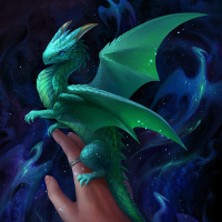 a fantasy scene with a dragon, which appears to be a small or baby dragon given its size relative to the hand holding it. The dragon is green with