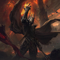intense battle, with lava and ash filling the sky, which aligns with the narrative of Sauron as an evil lord who seeks to dominate Middle-earth through his power and control over the ring.