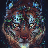 animal skin, the tiger appears to have leaves or foliage covering its body and face, giving it an almost naturalistic camouflage effect. This is artistic in nature, as it's not realistic for a tiger to have such vegetation on its body. The background is dark, providing contrast that highlights the tiger and its