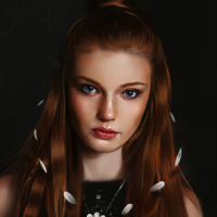 This is a portrait of a young woman with long red hair, looking directly at the camera. She has a neutral expression and appears to be wearing some jewelry or accessories in her hair. The image has a sepia tone which gives it a vintage or timeless quality. The background is plain and does not distract from the subject.