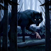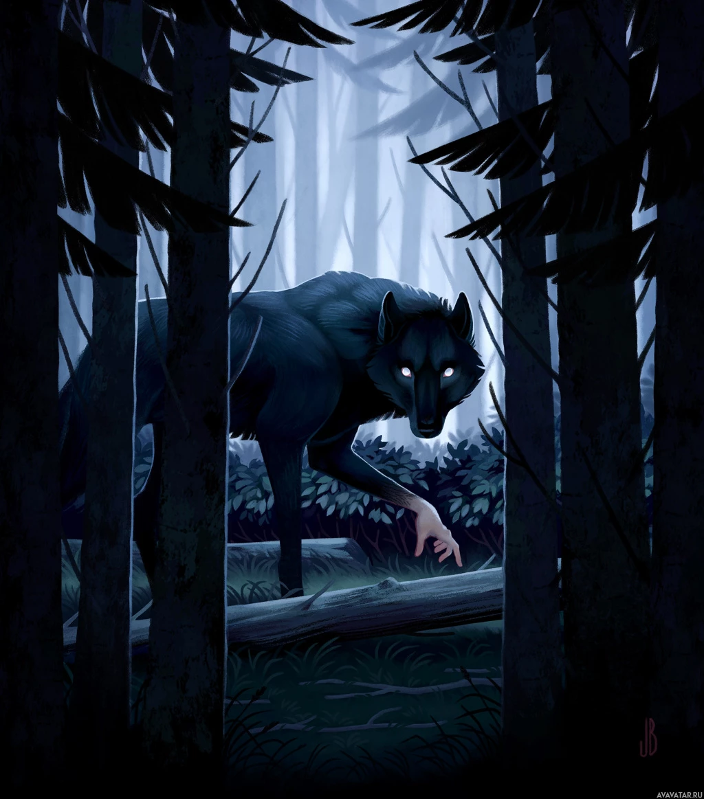 forest setting is dark and foreboding, suggesting a sense of danger or suspense, which fits well within the fantasy genre often associated with werewolves, as they are mythical creatures commonly found in folklore and storytelling. The image has been signed "J. B." in the bottom right corner.