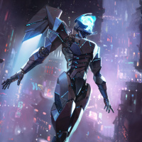the science fiction theme of the image. The overall aesthetic is dark yet vibrant, with a lot of contrast and depth, emphasizing the futuristic and high-tech elements present in the character's design.