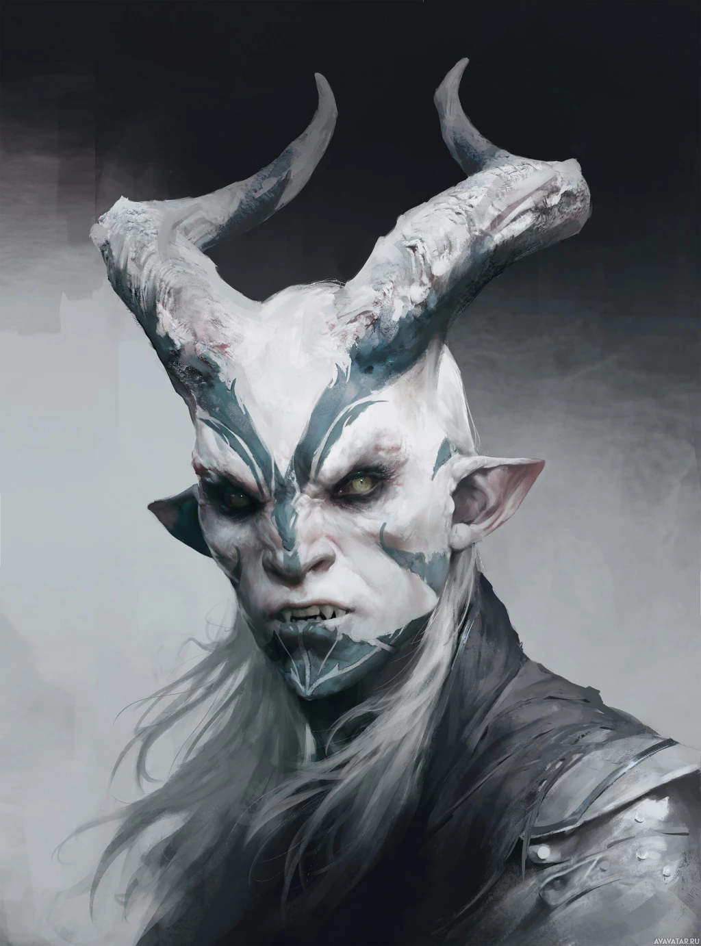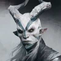 This image features a fantasy-themed portrait. The character depicted appears to be a demon, given the presence of horns and what seems to be a gnarled skin texture that is often associated with such