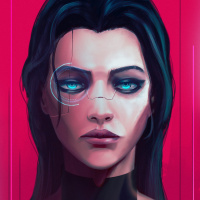 cybernetic enhancements, as indicated by the visible metal components on her neck and one eye. The background is