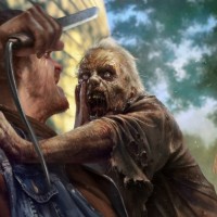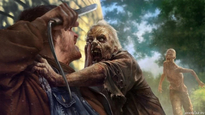 a scene of horror with several elements. There are two men in the foreground who appear to be engaged in some sort of violent encounter. One man is wielding a knife and seems to be either attacking or defending against the other. In the background, there are multiple figures that resemble zombies; these