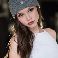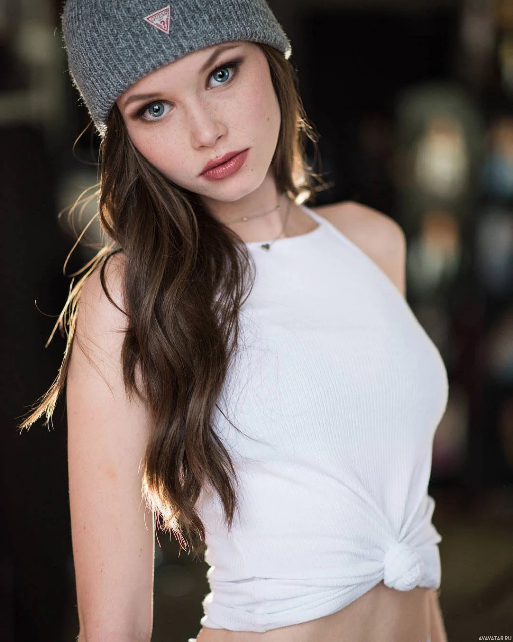 a young woman posing for the camera. She is wearing a beanie hat, a white off-the-shoulder top, and has her hair styled in