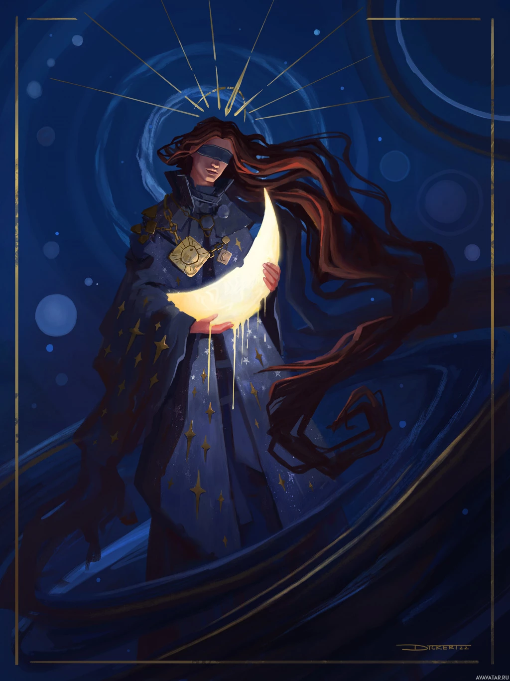flowing hair and a cloak. This person is holding what appears to be a moon or sphere, possibly symbolizing the moon, as they are standing on a body of water that resembles the ocean under a starry