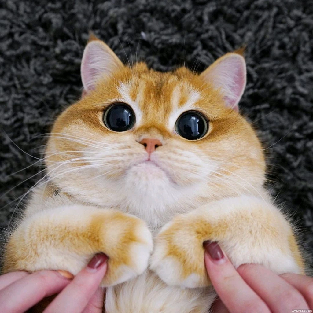 blue eyes. The cat has a distinctive, round face and a furry coat, which is typical of the British Shorthair breed known for its "chubby" appearance and large