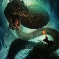 a rock structure, wearing what looks like armor, holding a sword, and appearing to interact with the snakes or command their attention. The color palette is rich with greens, blues, and grays that give a sense of depth and