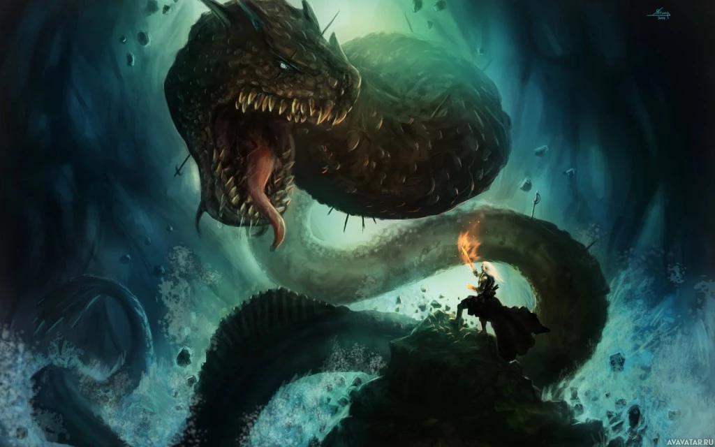 a fantasy scene with two large snakes, one on the left and the other on the right. They appear to be facing each other in