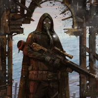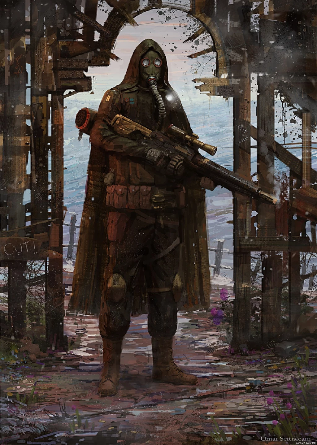 a respirator mask. The individual is also holding a weapon that appears to be a rifle or shotgun. They are standing in front of
