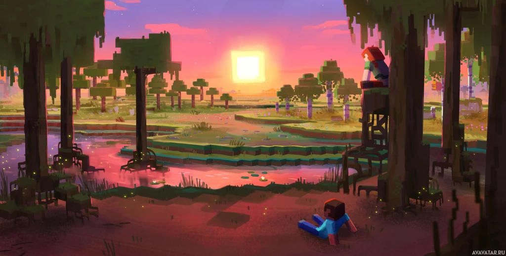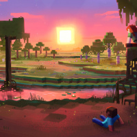 a warm light across the scene and highlighting the silhouettes of trees around them. The overall atmosphere suggests a moment of reflection or interaction between characters within
