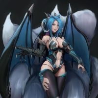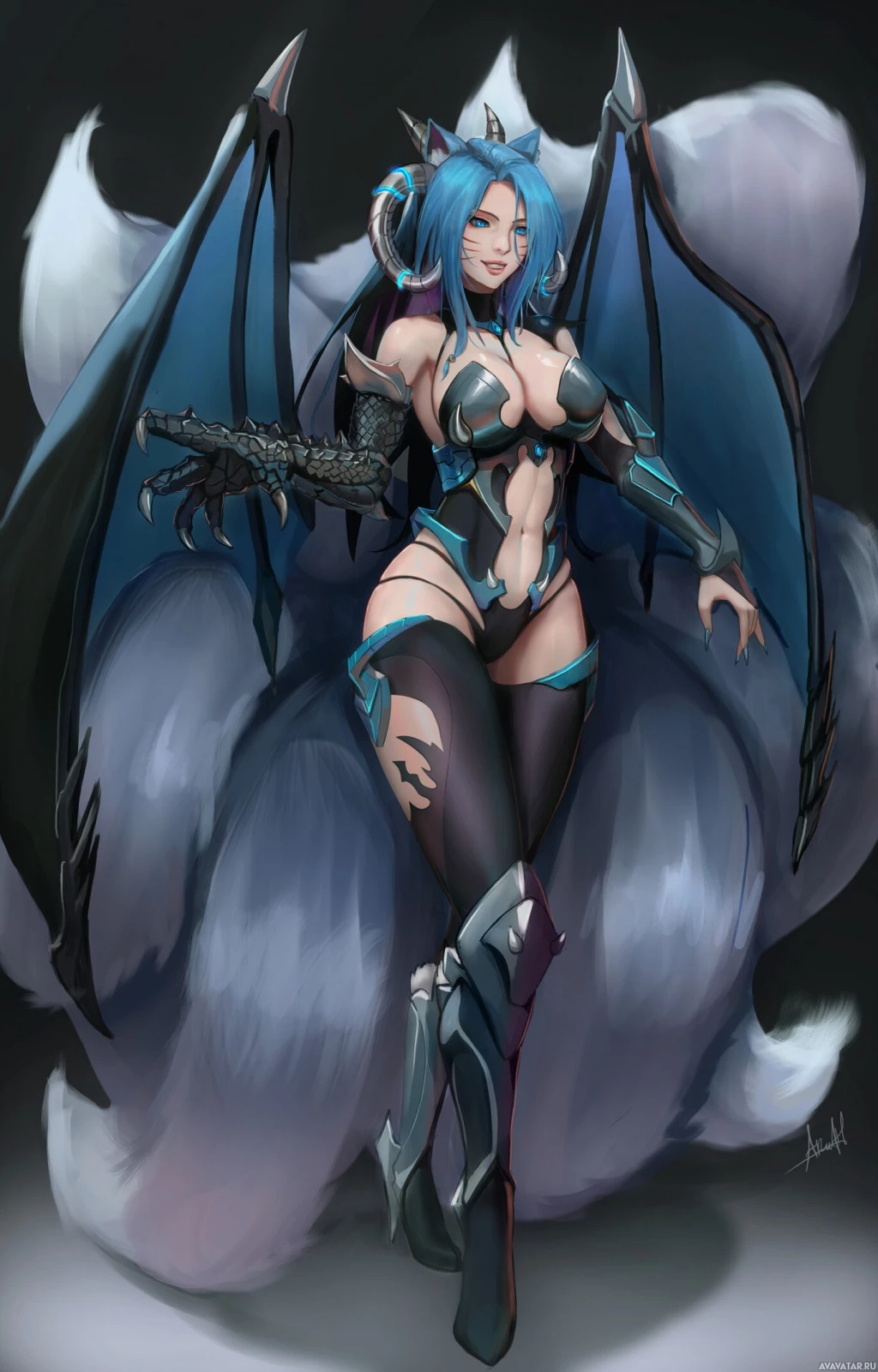 an elaborate costume that includes armor, leather elements, and what seem to be demonic features like horns and claws. Her attire also incorporates fur or a fur-like texture, which complements her feline tail that extends behind her. The character is posed with one hand on her hip and the other resting by her side, exuding confidence and