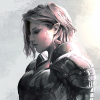 short hair and is portrayed in a thoughtful or contemplative pose. The artwork has a fantasy theme, possibly inspired by the style of