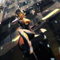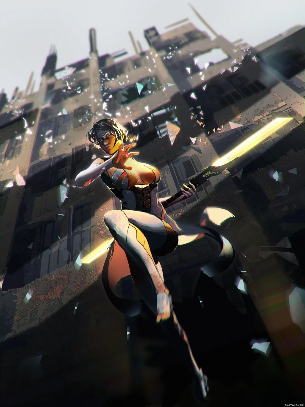 На картинке изображен женский персонаж, который, по-видимому, взят из видеоигры или графического романа. Она изображена в футуристическом стиле, в доспехах и с чем-то похожим на меч. На заднем плане изображена промышленная обстановка с разрушающимися зданиями, что может означать постапокалиптическую обстановку или сцену битвы. Ее поза указывает на движение или действие.