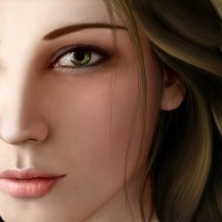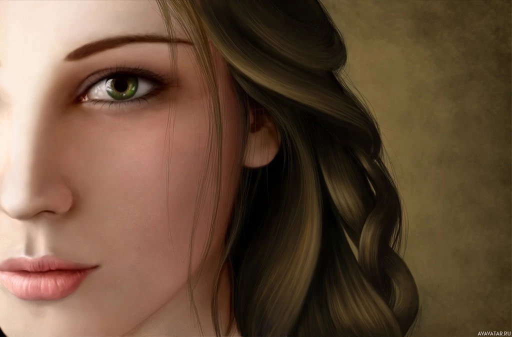 brown hair styled into braids, and her expression is neutral. The background appears to be a softly lit room or