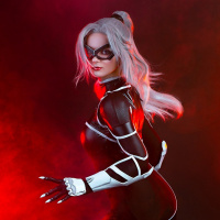 Black Cat from comic books. They are wearing a black and white bodysuit with a distinctive