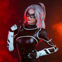Black Cat, a character from Marvel Comics. They are wearing a costume that resembles the comic book version of Black Cat, which includes tight-fitting black latex with white accents and a mask with