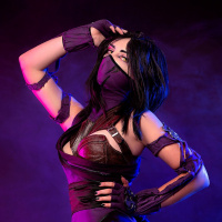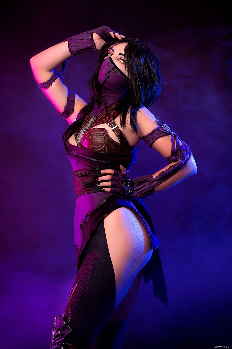 game series Mortal Kombat. The individual is wearing a costume that represents Mileena's attire in the game, which includes purple and black outfit with accents like a choker and arm wraps. They have their hair styled in a manner similar to Mileena's