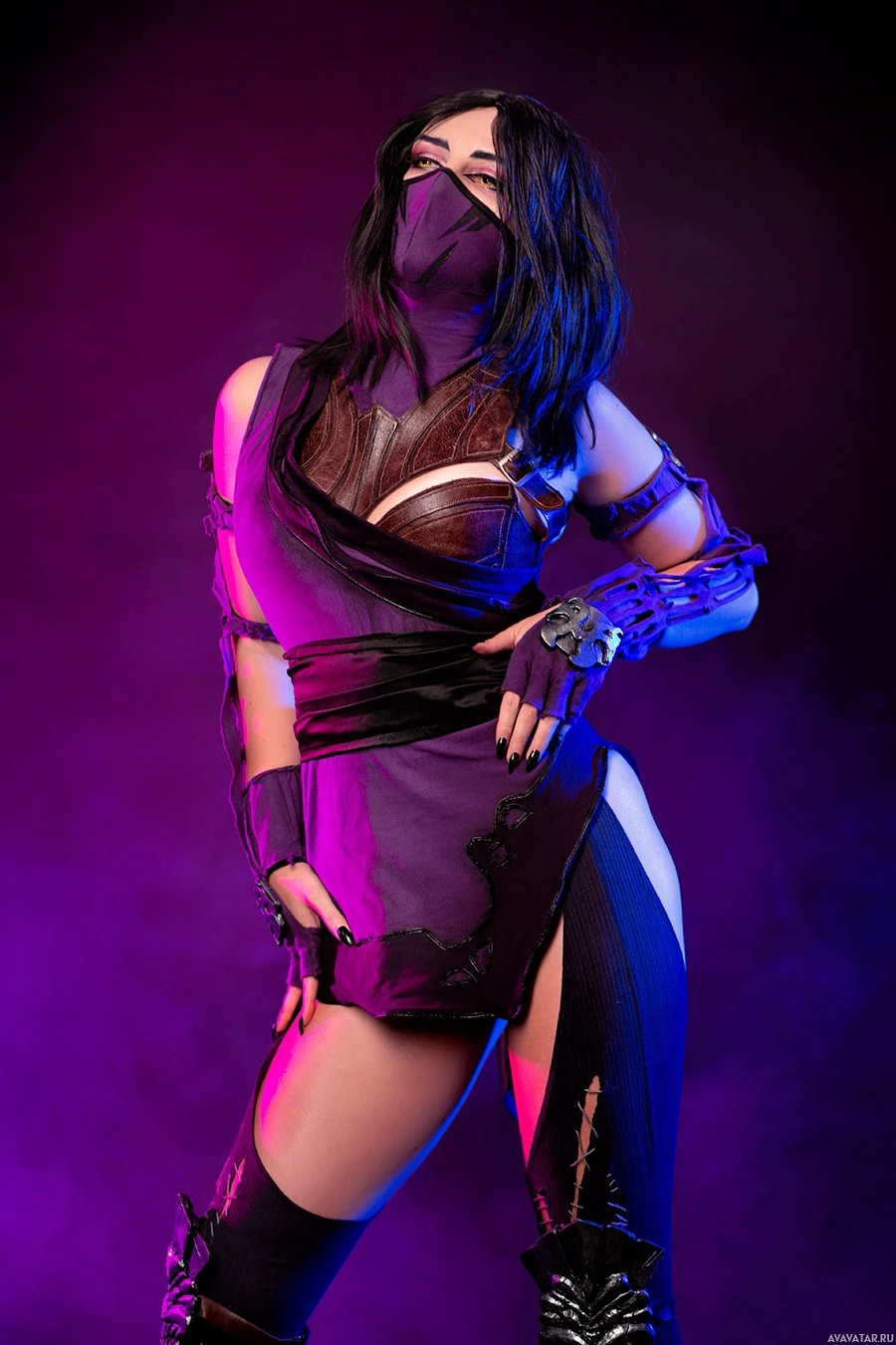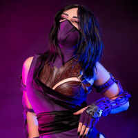 Mortal Kombat" franchise. The individual is wearing a costume that mimics Mileena's attire from the game, which includes a black and purple bodysuit with a corset-like top and torn stockings, along with arm wraps and