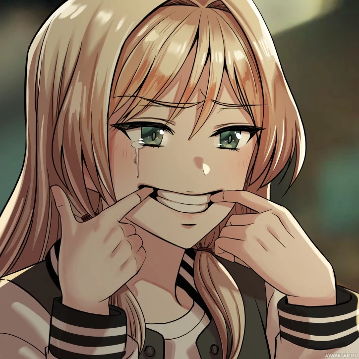 На картинке изображен анимационный персонаж, который выглядит как молодая женщина со светлыми волосами. Она широко улыбается и показывает на свои зубы, как будто демонстрирует их или что-то связанное с зубами. Стиль рисунка позволяет предположить, что это может быть из аниме-сериала или фильма.