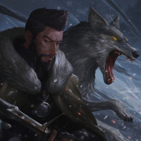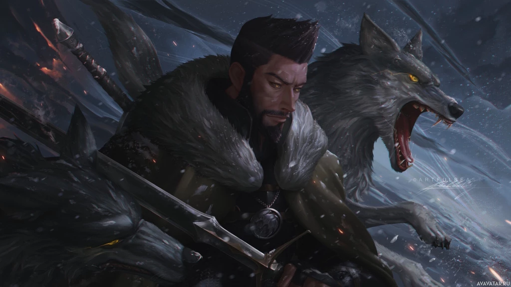a monster hunter, and here he appears to be in a battle with a large wolf, which is one of the creatures known to appear in the game. The setting seems to be a snowy, war-torn landscape, suggesting that this is an action or combat