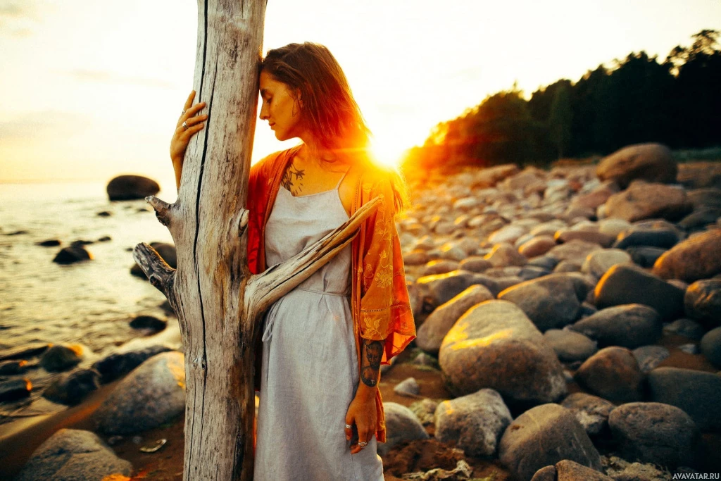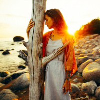 a rocky shore. She is facing away from the viewer and looking out towards what appears to be either a sunrise or sunset, given