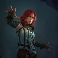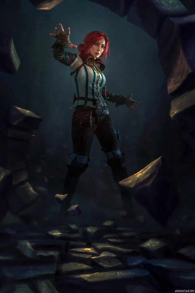 video game, specifically Triss Merigold, portrayed by actress Anna-Maria Sieklucka. The character is shown in a scene where she's emerging from what appears to be a cave or dungeon, wearing