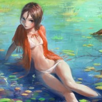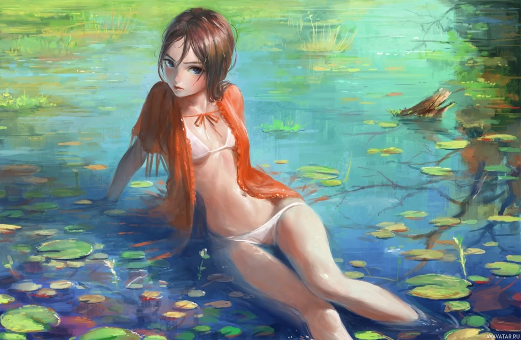 На картинке изображен иллюстрированный персонаж девушки, сидящей на краю водоема, возможно, пруда или озера. Она одета в купальники и имеет мирное выражение. На поверхности воды видны лилиевые прокладки. Цвета яркие с акцентом на естественные тона, которые придают сцене безмятежную атмосферу.