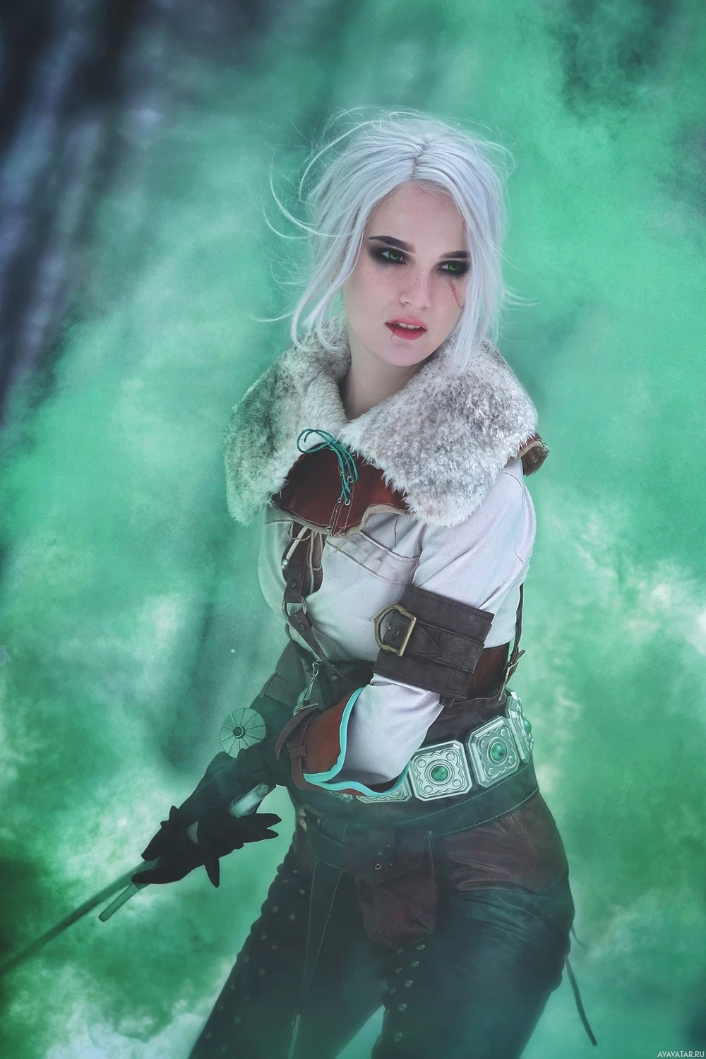 This image features a woman portraying the character Ciri from "The Witcher"