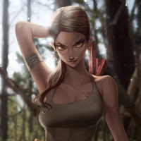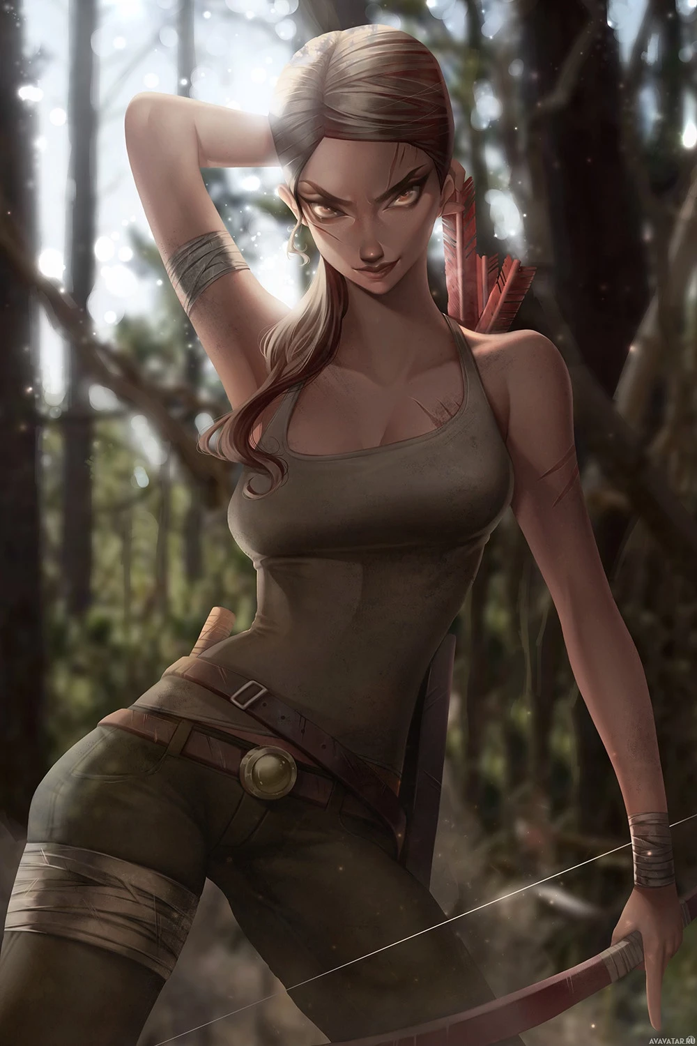 a female character that resembles Lara Croft from the "Tomb Raider" video game series. She is holding a bow and arrow, ready for action in what appears to be a jungle or