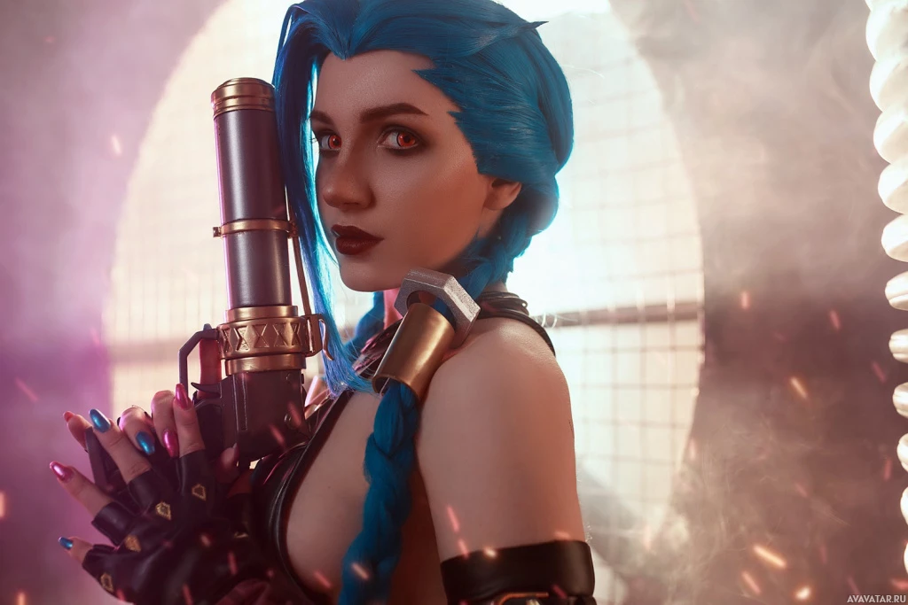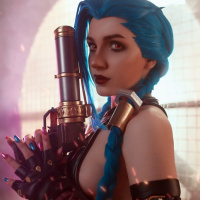 cosplay attire. The background suggests a thematic setting, possibly related to the character's in-