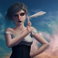 a paper airplane, which she appears to be about to launch. The background features a clear