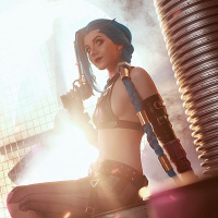a female character who appears to be Jinx from the game "League of Legends." She is styled in cosplay attire, which includes