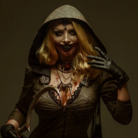 Evil Village, complete with a cape and a mask with what looks like a grotesque face. The