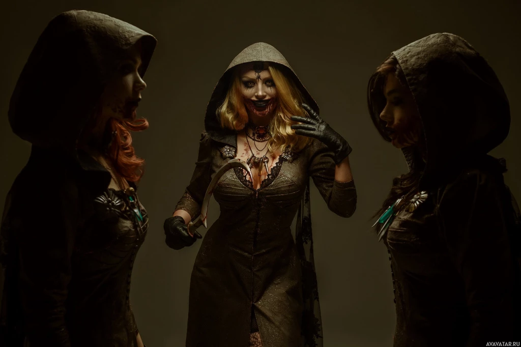 blonde hair styled into a wave. On the right, there's a character who appears to be dressed as a member of the Dimitrescu family from Resident