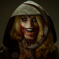a dark robe, gloves, and a hood that covers her hair. The overall style of the image suggests it might be related to cosplay, where people dress up as