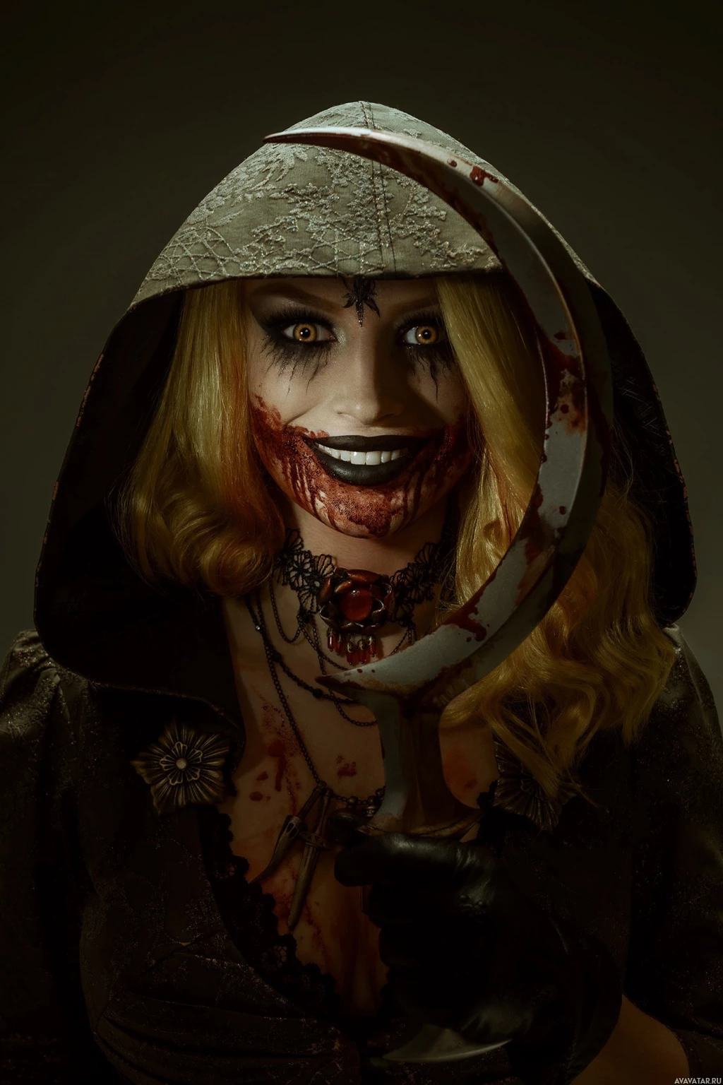 In this picture, there is a person wearing a costume that appears to be inspired by the character of Dimitrescu's Daughter from the game "