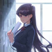 a school uniform, which suggests she may be a student. The setting appears to be inside a library or archive with bookshelves behind her. The character is holding what looks like a book or a folder in her hands, possibly indicating that she is engaged in some