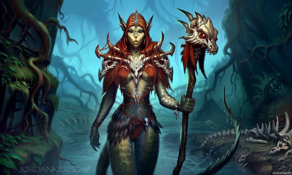 The image depicts a fantasy-themed character standing in what appears to be a forest or jungle setting with misty