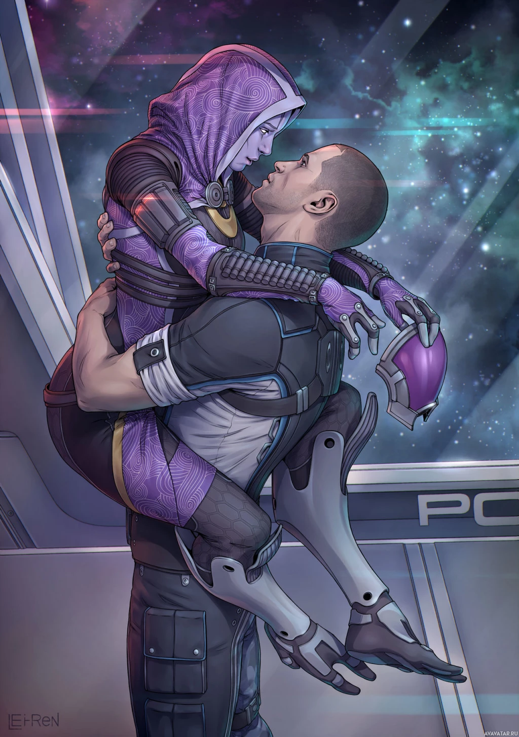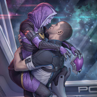 Mass Effect" series, a man and a woman. They appear to be in an embrace, possibly in a romantic or affectionate moment. Both characters are wearing armor that suggests they are part of a spacefaring mission or team within the game's universe. The setting looks like it could be inside a spacecraft with various technological elements and screens around them, which is consistent with the science fiction theme of the "Mass Effect" series.