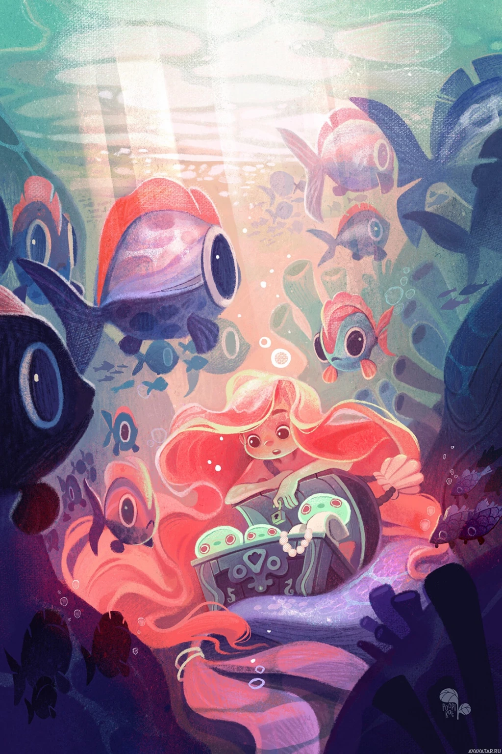 sea creatures, including fish of different sizes and colors, as well as other mermaids with their own unique appearances. The environment suggests
