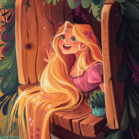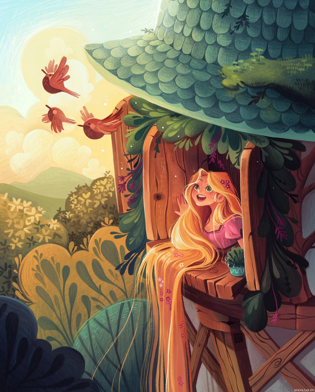 На картинке изображена анимационная сцена с участием персонажа, похожего на Рапунцель из диснеевского фильма "Запутанная история". Она сидит в чем-то похожем на скворечник, который был преобразован в уютное место. Вокруг нее летают птицы, а на заднем плане солнечное небо с облаками. Общая атмосфера образа - это атмосфера тепла и причудливости.