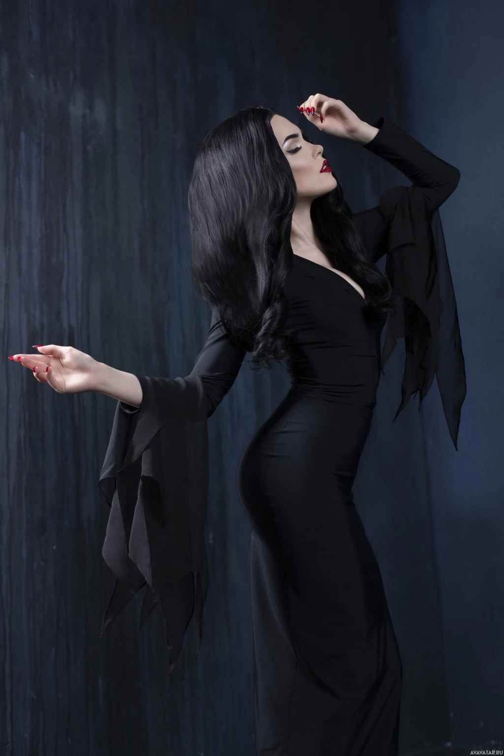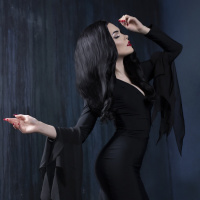 Morticia Addams from "The Addams Family," although it's not explicitly labeled as such within the image. The person has closed eyes and seems to be in a stylized or dramatic pose, which might imply that this is a creative or artistic representation rather than