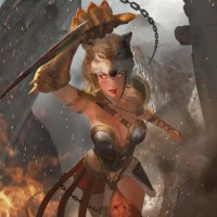 a rocky terrain with flames and smoke, indicating a chaotic environment. The overall style is reminiscent of high fantasy artwork often seen in