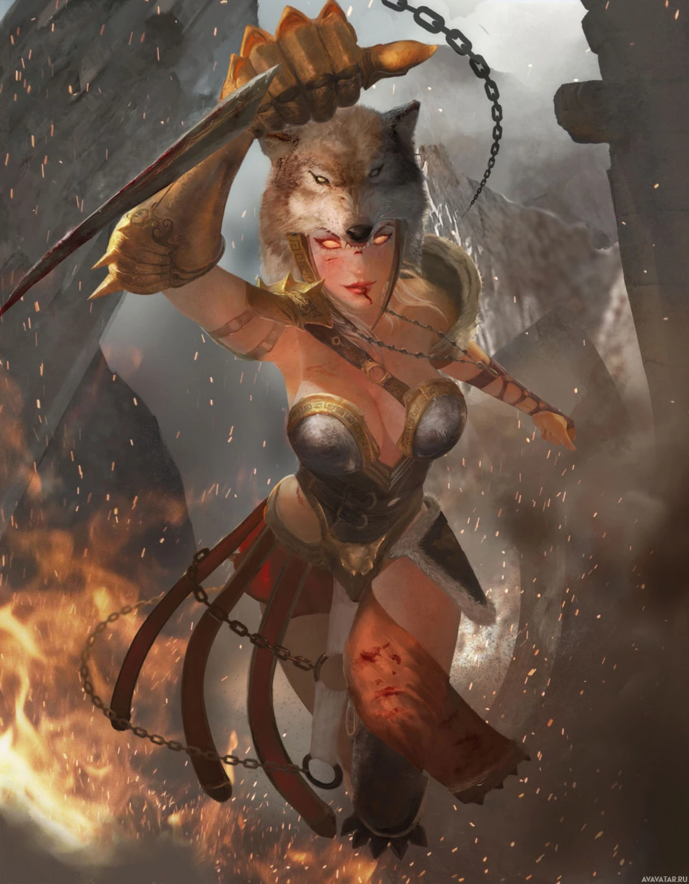 the head of a wolf, which adds a mythical or magical element to her appearance. There are also chain effects around her body, possibly indicating chains from an enemy or some