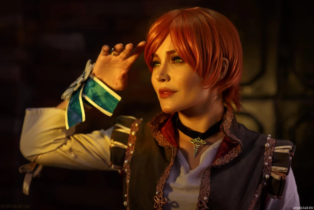 The image shows a person dressed in cosplay, which is the practice of dressing up as a character from a movie, book, or video game. In this case, the person is wearing a costume that resembles Shani from "The Witcher 3: