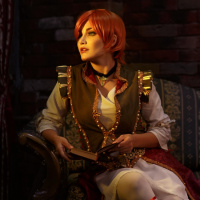 The image features a person dressed as Shani, a character from "The Witcher" series. They are seated on what appears to be a stage or a set designed for performance or filming, with the lighting focused on them and creating a dramatic atmosphere.