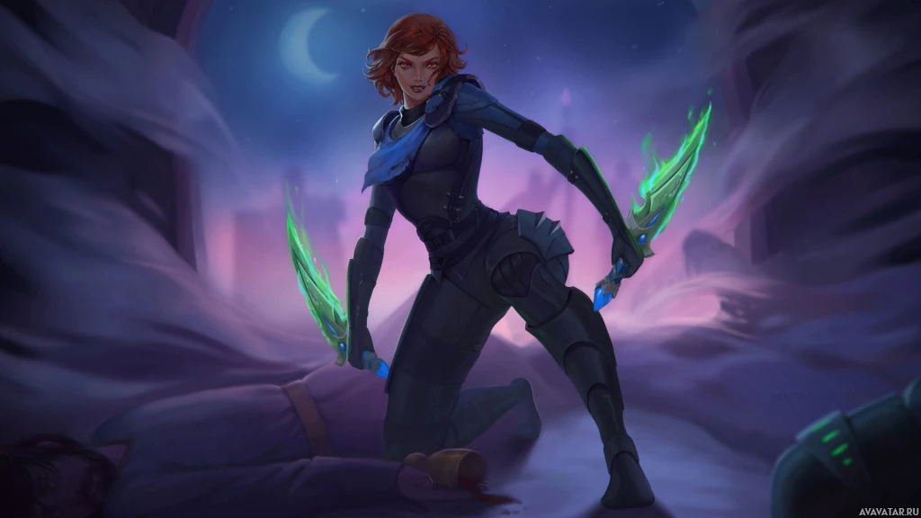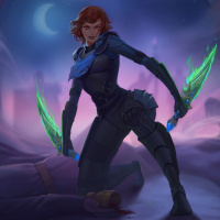 red hair, is wearing armor with what appears to be a utility belt or pouches attached, and is holding two glowing blue weapons that resemble blades or swords. She seems to be posed confidently, as if ready for combat or action. This character could be from a fantasy